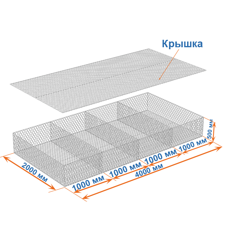 Габион матрац ГСИ-М 4х2х0,5 оцинкованный / ЦП, Ø проволоки 2,4/3,4мм, размер ячейки 6х8 см
